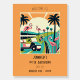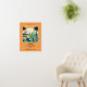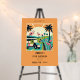 A bold and colorful art-deco-style 50th birthday party welcome sign in vibrant orange, green, and cream with pink flamingos, a golf cart, and palm trees. Use this foam board to steer your guests towards the right party. Hopefully, the birthday gal scored a hole-in-one, and you can celebrate it accordingly!