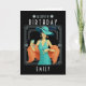 Send birthday wishes in roaring twenties fashion with this Art Deco style design with an illustration of a glamorous lady in teal 1920s fashion dress and hat, holding a cocktail and the set typography Happy Birthday in white. Easily personalise your recipient’s name at the bottom and your message inside. The black background can be changed to another color if you so wish via the Click to Customize Further option.