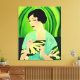 Canvas in a modern, semi-abstract, Art Deco portrait of a lady in a kimono, holding a fan, against a jade green abstract background