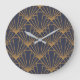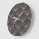 This clock has art deco design of diamonds and triangles in gold on a field of blue.
