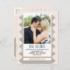 This save the date postcard features gold and black art deco horizontal lines and a customizable photo frame. The text, below the photo, allows you to add your wedding details. The backside offers customizable return address text.