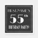 This stylish fifty-fifth birthday celebration paper napkin design features an editable name, a fancy art deco look inspired number “55th”, the message “BIRTHDAY PARTY!”, and a multi-line border. There is a black-colored background by default, but it can be customized to a different color, if desired. Paper napkins like these might be used at a birthday party for somebody who is celebrating their 55th birthday. [~Z0000612]