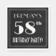 This stylish fifty-eighth birthday celebration paper napkin design features a custom name, a fancy art deco look inspired number “58th”, the message “BIRTHDAY PARTY!”, and a multi-line border. There is a black-colored background by default, but it can be customized to a different color, if desired. Paper napkins like these might be used when celebrating somebody’s fifty eighth birthday. [~Z0000612]