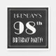 This stylish and Roaring Twenties inspired ninety-eighth birthday party paper napkin design features an editable name, a fancy art deco look inspired number “98th”, the message “BIRTHDAY PARTY!”, and a multi-line border. The background is colored black by default, but it can be customized to a different color, if desired. Stylish birthday themed paper napkins like these might be used at a party in celebration of somebody’s ninety eighth birthday. [~Z0000612]