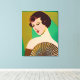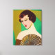 Canvas in a modern, semi-abstract, Art Deco inspired portrait of a demure lady, holding a fan, against a jade green and gold colored background