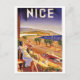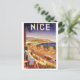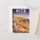 This postcard is a replica of a vintage Art Deco travel poster for Nice, France and is a stunning work of art. The poster features an elegant lady relaxing on a balcony, with a view of the city below. The city is depicted in a vibrant Art Deco style, with fashionably dressed people walking next to classic cars on the road lined with palm trees. The road curves around the coast to hills on the horizon, and there are people on the sandy beach and sailing boats at sea. The foreground is filled with flowers, adding a touch of beauty and elegance to the scene.