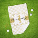 This design features a seahorse with a gold effect ocean wave pattern. The Art Deco style coastal image makes a modern and unique golf towel with personalized text.