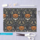 A dramatic Art Deco–inspired Halloween repeating pattern set against a deep black background, featuring sleek, stylized black cats with glowing green eyes arranged in a bold, symmetrical rhythm. Classic Halloween motifs—jack-o’-lanterns, crescent moons, bats, spiders, spiderwebs, witches’ hats, and sparkling geometric stars—are rendered in refined Deco forms with clean lines and elegant contrast. A limited palette of inky black, warm pumpkin orange, champagne gold, and soft ivory creates a glamorous, nocturnal mood that feels luxurious and sophisticated rather than playful.