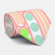 This tie has a design made of long ovals filled with circles, diamond shapes, or lines in pink, coral, green, and blue.