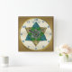 The elegant original design on this wall clock features a large centered star flower shaped mandala that takes it’s inspiration from Art Deco and highly stylized Peacock Feathers, enhanced by techniques creating a faux metallic look in shades of bronze, turquoise, emerald green & pewter. Option to personalize w/ your initials. Choose square or round shape.