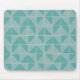 This mouse pad has an art deco design of squares divided in half by diagonal lines of silver. The squares are then pieced together on a field of turquoise.