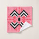 This towel set has an art deco quilt-inspired design of diamond shapes in black, white, and pink on a field of watermelon.