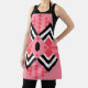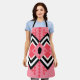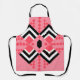 This apron has an art deco quilt-inspired design of diamond shapes in black, white, and pink on a field of watermelon.