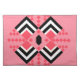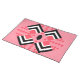 This placemat has an art deco quilt-inspired design of diamond shapes in black, white, and pink on a field of watermelon.
