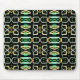 An attractive abstract geometric patterned design in gold, white green and fiery copper red on a black background. The shapes are perhaps reminiscent of 1930s Art Deco Radios and broadcasting equipment with crystal like shapes which was of course the means of early radio broadcasting