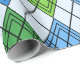 This wrapping paper has an art deco design of diamond shapes made from overlapping angles in black lines colored in shades of blue and green with diagonal black lines making the design look like argyle