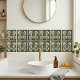 Step back in time with this exquisite ceramic tile, inspired by the bold geometric aesthetics of the Art Deco movement. A central stylized rose, rendered in a striking emerald green and accented with warm bronze hues, is framed by a symphony of angular lines and symmetrical patterns. The sophisticated color palette, featuring deep blues, rich greens, and touches of maroon, is beautifully complemented by shimmering gold detailing, evoking the glamour of the 1920s. This tile is an ideal choice for creating a focal point in your home, whether it's for a stylish kitchen, a chic bathroom, or an eye-catching feature wall, bringing a sense of timeless glamour and artistic flair to your decor.