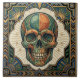 This stunning ceramic tile features a vibrant Art Deco-inspired skull design, boasting a striking combination of emerald green, warm orange, and shimmering gold accents. The intricate details of the skull are enhanced by the decorative border, which includes sunburst motifs and geometric patterns, evoking a sense of vintage elegance. Perfect for adding a unique artistic touch to any space, this tile is a true statement piece for lovers of bold, stylized artwork and the iconic Art Deco era.