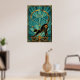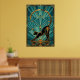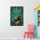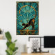 An elegant black cat silhouette stretches gracefully with a golden curved tail forming a perfect arc, framed by teal fan rays and architectural accents. This refined 1920s art deco composition captures poised sophistication, making it ideal for yoga studios, living rooms and modern spaces where cat lovers seek stylish, timeless decor.