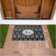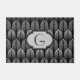 Doormat in a vintage Art Deco wallpaper pattern based on a stylized feather - shades of silver gray / grey on a black background with customizable monogram