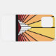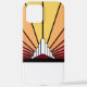 An iconic pattern of the sun rising from behind a stylized art deco shaped building. A simple yet elegant design, true to the era.