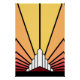 An iconic pattern of the sun rising from behind a stylized art deco shaped building. A simple yet elegant design, true to the era.