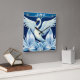 A white swan spreads its wings over art deco lilies on a beautiful blue background.