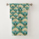 A Bath Towel Set In A Teal And Gold Art Deco Fan Style Pattern For Your Bathroom Deco