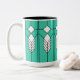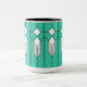 This mug has an art deco stained-glass window design of diamonds and lines in white, black, and turquoise.