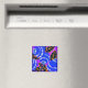 This pretty and useful refrigerator magnet feature's digital artist's, Leslie Sigal Javorek, original adaptation of a classic Art Deco wallpaper pattern, shown here in shades of royal blue,orange,violet and black and with some shaded contours to give it the illusion of depth.
