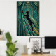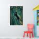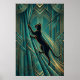 A contemplative black cat silhouette perches on a geometric teal windowsill gazing outward, framed by stylized golden curtain folds and orange sunset rays. This elegant 1920s scene brings peaceful sophistication to bedrooms, hallways and living spaces.