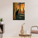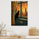 A contemplative black cat silhouette perches elegantly on a teal geometric windowsill, framed by stylized golden curtain folds and warm orange sunset rays. This serene 1920s art deco composition brings peaceful sophistication to bedrooms, hallways and living rooms, creating a perfect focal point for cat enthusiasts and modern decor lovers.
