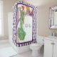 An Art Deco woman in a green dress stands next to your monogram. She is adapted from a vintage illustration courtesy of New York Public Library. The background is an Art Deco pattern done in purple and white.