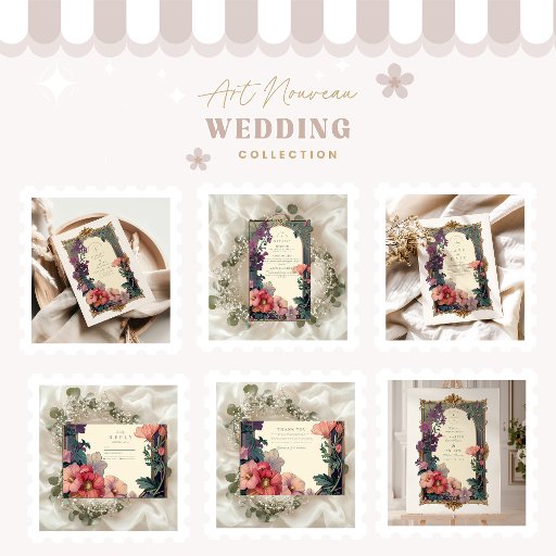 A luxurious Art Nouveau wedding design featuring an ornate baroque-style gold frame intertwined with vivid botanical elements. Deep plum, blush, and coral florals curl naturally through the corners, bringing an elegant fusion of vintage romance and decorative opulence. Ideal for couples drawn to timeless art and lush, sophisticated detailing.