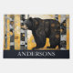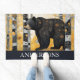 Beautiful artistic custom name door mat with a cute winter forest scene with rustic black bear.