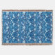 of stylized birds, flowers, strawberries, and leaves, digitally enhanced and colored in shades of cobalt blue, light blue, and white, on a deep indigo blue background