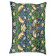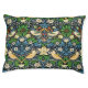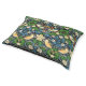 Pet bed in a William Morris Art Nouveau tapestry pattern of stylized birds, flowers, strawberries, and leaves in soft shades of blue, green, beige and tan on a dark indigo blue background