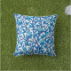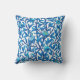 Pillow in a William Morris Art Nouveau tapestry pattern of exotic birds in a pomegranate tree, with cobalt and cerulean blue leaves, birds and fruit in blue and turquoise, and a white background