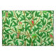 Placemat in a William Morris Art Nouveau tapestry pattern of exotic birds in a pomegranate tree, with emerald green leaves, birds and fruit in lime green and deep ruby red, and a pastel lime green background