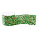 Ribbon in a William Morris Art Nouveau tapestry pattern of exotic birds in a pomegranate tree, with emerald green leaves, birds and fruit in lime green and deep ruby red, and a pastel lime green background