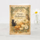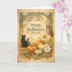 A graceful, vintage-inspired Halloween illustration adorned with ornate botanical filigree and soft, aged parchment tones. Curving vines, ivy leaves, and delicate white florals form an elegant frame around a serene autumn scene. A classic black cat sits quietly beside heirloom pumpkins and a smiling jack-o’-lantern, while a watchful owl perches above beneath a crescent moon and drifting bats. The refined typography and muted, storybook palette evoke Victorian-era illustration and Art Nouveau influences, creating a Halloween design that feels romantic, timeless, and gently mysterious.