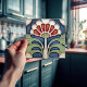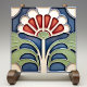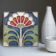 Embrace the timeless elegance of the Art Nouveau era with this exquisitely designed decorative ceramic tile. The design features a stunning, stylized central flower, capturing the organic, flowing lines characteristic of the period. The heart of the bloom glows with a vibrant, segmented orange-red, while graceful petals in a sophisticated dusty slate blue unfurl around it. The entire composition is brought to life through a beautiful tube-lining technique, where raised, creamy off-white lines define each element, creating a delightful tactile quality and a stained-glass effect. Flanked by soft sage green leaves and accented with intricate, wheel-like motifs, this tile is a balanced work of art. Perfect as a standout piece in a kitchen backsplash, a unique feature in a bathroom, or framed as a standalone art piece.