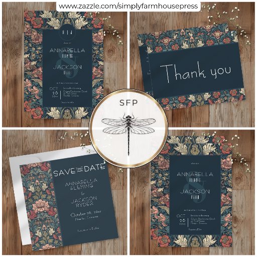 Indulge in the enchantment of the past with our vintage floral wedding save the date card. Inspired by the iconic patterns of William Morris, this design feature a mesmerizing blend of teal blues, pinks, creams, and green. The intricate floral patterns, reminiscent of the Art Nouveau era, this design adds vintage allure to your special day. The elegant vintage font on a dark blue background provides a striking contrast to the vibrant floral backdrop. This timeless design captures the essence of classic romance, making it the perfect choice for couples seeking a truly unique and unforgettable invitation. Created by Simply Farmhouse Press.