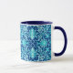 Art Nouveau textile pattern coffee mug, based on a vintage William Morris chinoiserie ceramic tile design, digitally rendered and colored for a soft, watercolor effect - turquoise and white on a cobalt blue background