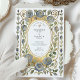 Introduce your wedding with unforgettable elegance using this stunning Art Nouveau-inspired invitation. This design features a sophisticated watercolor illustration of stylized roses in beautiful shades of dusty and slate blue, each accented with a touch of antique gold. The unique blue florals are intertwined with soft sage green leaves and flowing vines, creating a luxurious and artistic border. An ornate, textured gold oval frame encloses your wedding details, which are set in a timeless combination of serif and script fonts. This invitation is perfect for the couple seeking a unique, artful, and supremely elegant aesthetic for their vintage, formal, or autumn wedding.