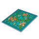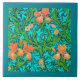 Ceramic tile in a William Morris, textile print of irises and leaves, digitally enhanced and colored, in orange, lime green, and soft aqua, on a deep turquoise background
