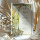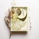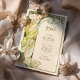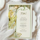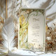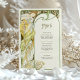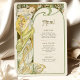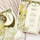 Capture the enchantment of a moonlit evening with this Art Nouveau-inspired wedding menu card. Featuring a graceful woman surrounded by blooming flowers and framed by a large crescent moon, this design is a stunning blend of celestial and natural beauty. With soft greens, golden yellows, and rich black contrasting against the ivory backdrop, this card evokes romance and elegance in a vintage style reminiscent of Alphonse Mucha's work. The back of the card beautifully presents the menu in a classic, refined font. Ideal for weddings with a romantic, vintage, or celestial theme, this menu card brings a timeless charm to your special day.