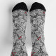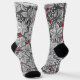 Socks in an Art Nouveau pattern of strawberry plants, with leaves, flowers and berries, based on a vintage William Morris textile design, digitally enhanced and colored in black and white, with a dark graphite gray /grey background, and an accent of deep red berries
