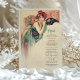 This enchanting wedding menu features a gorgeous Art Nouveau illustration of a vintage lady adorned with a floral crown and dressed in an elegant green gown. The artwork is a perfect reflection of early 20th-century design, with intricate details and flowing lines that evoke a sense of grace and sophistication. The warm tones of soft blush, sage green, and floral red, combined with the delicately stylized elements, make this menu an ideal choice for a vintage or nature-inspired wedding.