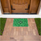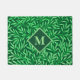 Doormat in a William Morris Art Nouveau textile pattern of stylized willow branches and leaves in shades of light lime green, accented with white, on a dark emerald / pine green background, with monogram